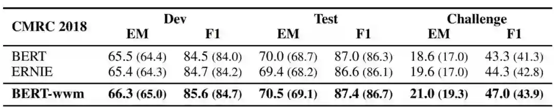 表 3:三个模型在 CMRC 2018 数据集上的表现。最好的学习率分别为:BERT (3e-5)、 BERT-wwm (3e-5)、ERNIE (8e-5)。