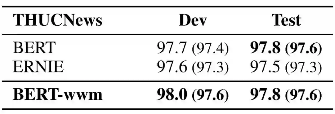 表 10:模型在清华新闻数据集的表现。最好的模型学习率分别是:BERT (2e-5)、BERT-wwm (2e-5)、 ERNIE (5e-5)。
