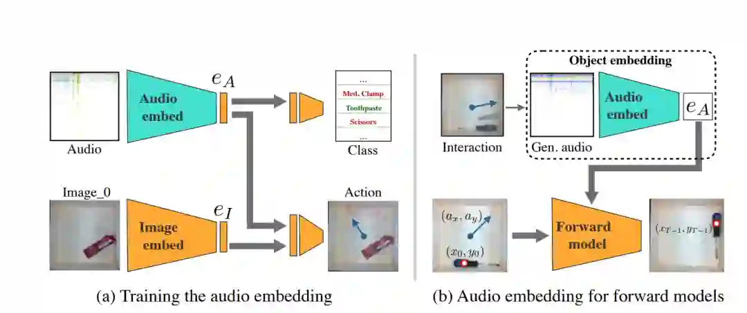 (a)训练音频嵌入,我们执行多任务学习,例如上方的实例识别和下方的动作回归,(b)一旦嵌入网络经过训练,我们可以将提取的音频嵌入用作下游任务(如正向模型)的对象特征学习。图片出处:arXIV