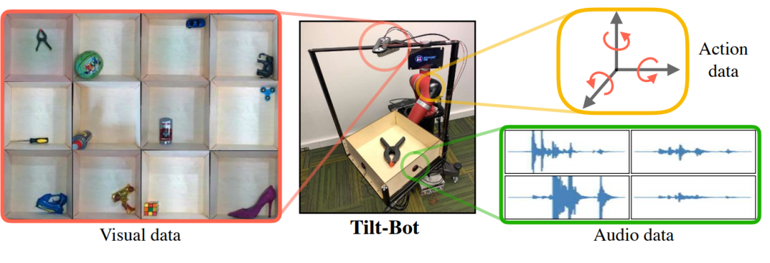 关于这项研究的论文由机器人学顶级会议 Robotics: Science and Systems 接收,其中还介绍了迄今为止创建的最大的声音+动作+视觉数据集——Tilt-Bot 数据集,由名为 Tilt-Bot 的机器人平台与各种对象进行交互收集而来。