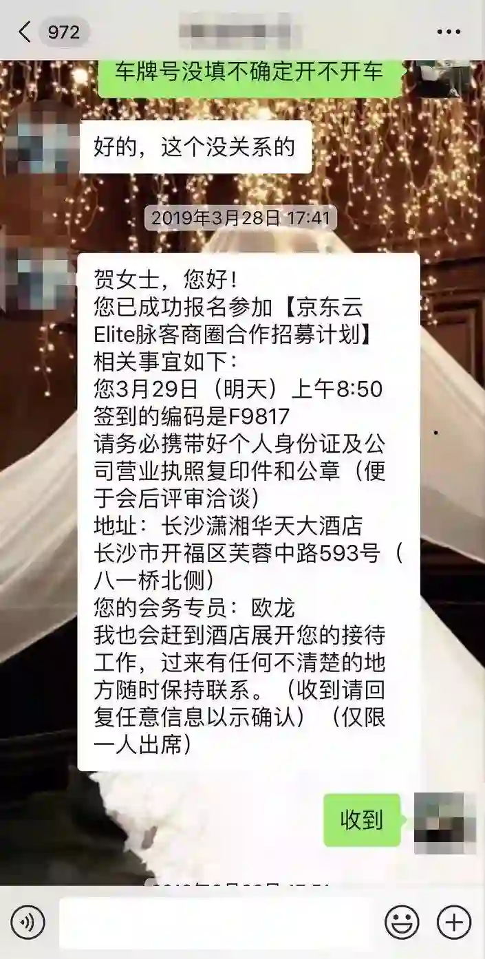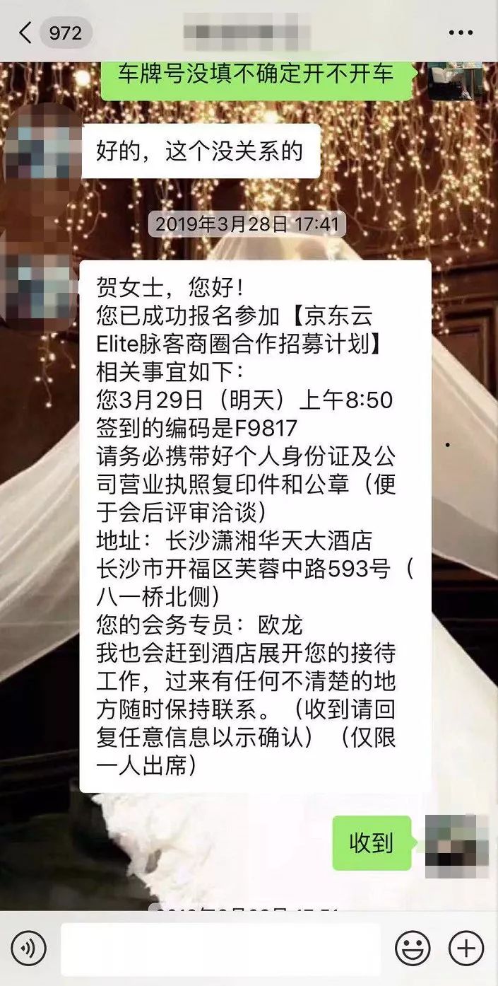 根据多位代理商的描述,他们在今年上半年接到自称是京东工作人员的电话,邀请参加京东新项目的会议,主题是招募京东云Elite脉客商圈城市合伙人。参会需要携带企业公章,会场选在当地的高档酒店。