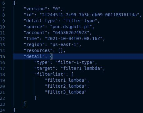 module.exports.next_filter = (async function (event) {var i = event.detail.filterlist.indexOf(event.detail.target);if (event.detail.filterlist.length === i + 1) {return null;} else {event.detail.target = event.detail.filterlist[i + 1];var finalEvent = {"Source": event.source,"EventBusName": "mypipe","DetailType": event["detail-type"],"Time": new Date(),"Detail": JSON.stringify(event.detail, null, 2)}var Entries = [];Entries.push(finalEvent);var entry = { "Entries": Entries };var result = await eventbridge.putEvents(entry).promise();return result;}});