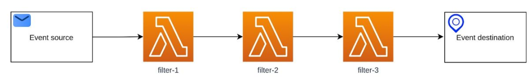 如上图所示,事件最初会到filter1_lambda中,因为客户端事件的detail.target属性与目标为 filter1_lambda 的filter-rule1事件模式相匹配。执行完成后,filter1_lambda 将事件的detail.target设置为下一个lambda,即filter2_lambda,并将修改后的事件发回给事件总线。由于 detail.target 的值是filter2_lambda,所以 filter-rule2就会被触发,如此反复。通过这个递归过程,所有的过滤器都会被执行。最后一个过滤器可以调用一些其他资源,而非调用next_filter() 工具层。