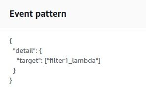 基于测试事件的具体detail.target 值,会有一个规则匹配并执行。在我们的场景中,这将会导致事件 / 消息会路由到与规则关联的目标 lambda 上,即filter1_lambda。