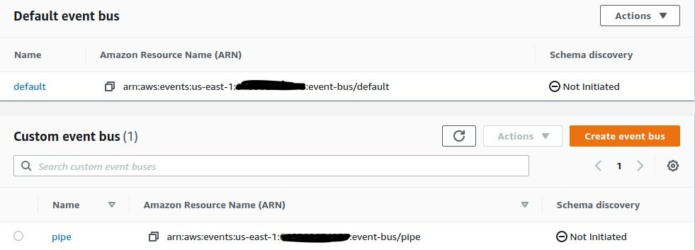 事件总线是 EventBridge 的关键组件之一。事件总线接收来自不同源的事件 / 消息,并将它们与一组定义的规则相匹配。EventBridge 有一个默认的事件总线,但用户也可以创建自己的事件总线。在这个 POC 中,我创建了一个名为“pipe”的事件总线。