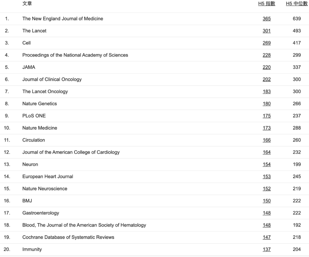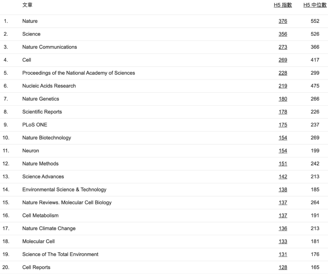7月8日,谷歌发布了2020版的谷歌学术指标(Google Scholar Metrics,GSM),涵盖期刊为2015-2019 年间发表的所有文章。谷歌学术指标提供了一种简便的方法,让学者们可以快速评估学术出版物最近文章的影响力。 根据此次排名,Nature以376力压群雄,登顶排行榜。而被称为“神刊”(四大水刊)的PLOS One(IF=2.74)力压多个顶刊,进入医学及生命科学TOP10!超过Nature Med,排名第九。 h指数(h-index ) h指数(h-index )是一个混合量化指标,最初是由美国加利福尼亚大学圣地亚哥分校的物理学家乔治·赫希(Jorge Hirsch)在 2005 年的时候提出来的,其目的是量化科研人员作为独立个体的研究成果。Hirsch 的原始定义是,一名科学家的 h 指数是指其发表的N篇论文中有 h 篇每篇至少被引 h 次、而其余N-h篇论文每篇被引均小于或等于 h 次。Google 使用h5指数评价一个期刊的影响力,它表示的意思是 5 年内有 h 篇文章被引用超过 h 次。 谷歌h5指数的算法不同于影响因子,不光考虑期刊文章的篇均被引,是一个平衡发文量与被引次数的指标,其定义极具数学上的美感,具体可参见《扫盲一下谷歌H5指数》。