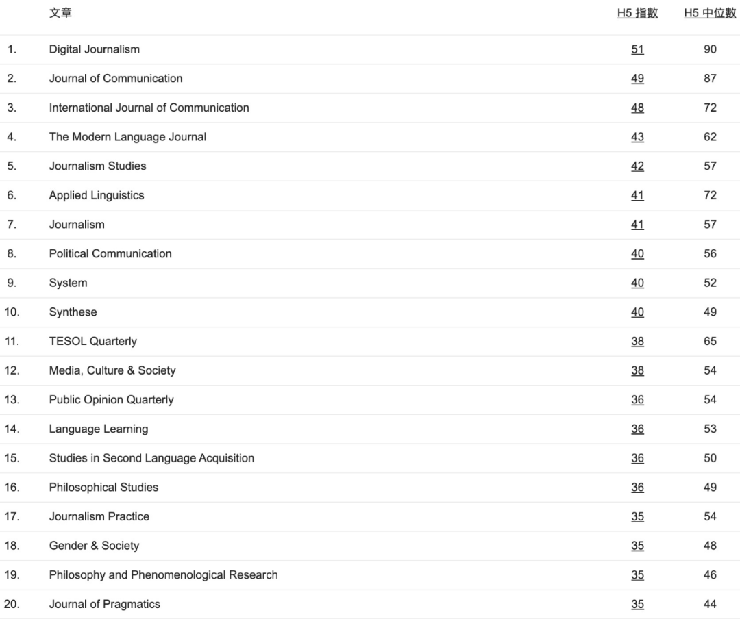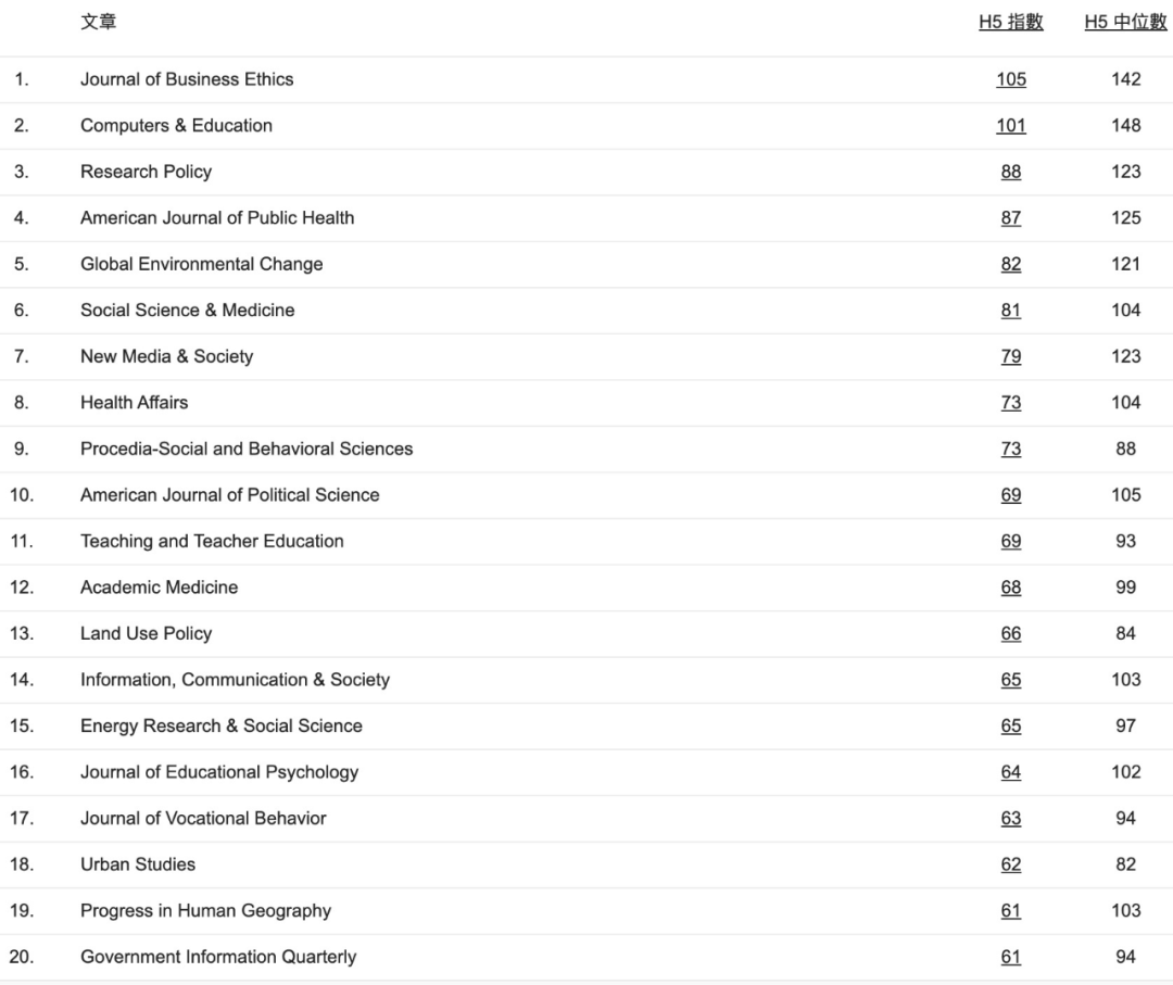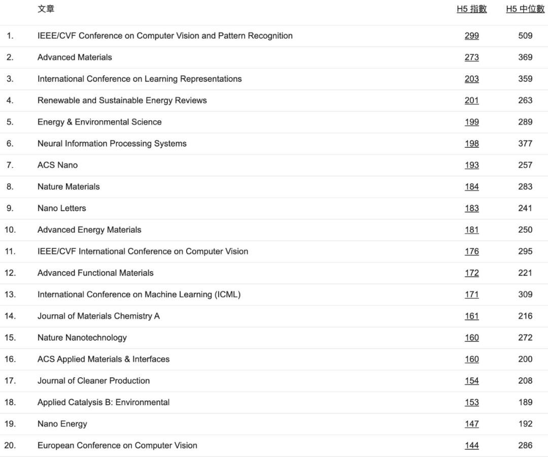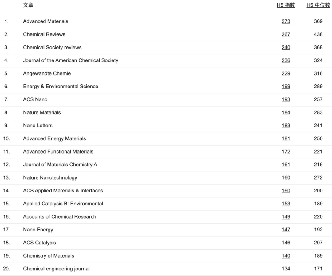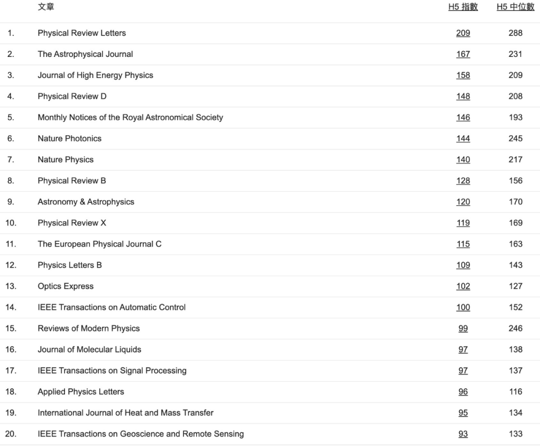 H5指数靠前的,基本上都是些发文量非常大的刊物,而影响因子最高的神刊 CA ,在H5指数排名中,前100名都没进去,究其原因还是:影响因子本质上是一个篇均引用次数,在总发文量不大的情况下,容易产生少量高引文章大幅拉高影响因子的情况。 而H5指数除了考虑每篇文章的引用次数外,还与期刊的总发表文章数量正相关,按其定义,在篇均引用次数差不多的情况下,某期刊发表的文章越多,其H5因子越容易上去,Nature、Science就是这种刊,用H5去衡量,简直就无敌了。 参考链接:https://scholar.google.com/citations?view_op=top_venues版权声明:本文来源科研大匠、察言观数,仅用于学术分享