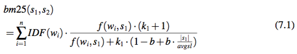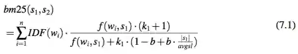 用 BM25 计算相似度给定一个纯文本语句 s1,一个回答语句 s2,和单词集合 w1 , ..., wn , 它们的 BM25 分数为: