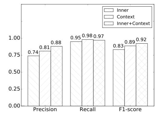 DAKSE 将目标语句本身(Inner)和其上下文语句(Context)视为特征。 实验评估了这些特征在百度百科上做 DKS 分类的贡献,结果展示在图 7.3 中。这里 “Inner”指模型只使用目标句子作为特征。“Context”指模型只使用上下文作为特 征。“Inner+Context”是本章提出的模型。