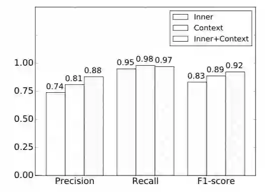 这些模型的召回率几乎是一样的,然而通过添加上下文特征,精度有所提高。该结果验证了这两个特征的贡献。
