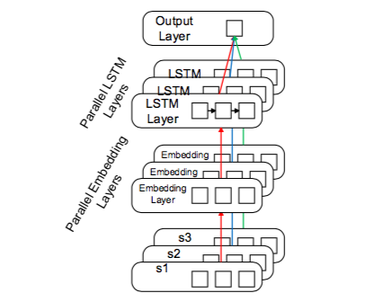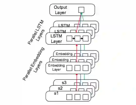 本节详细说明 DKS 分类器。 DKS 分类器判断一个纯文本语料中的句子是否是一 个 DKS。它将种子 DKS 视为正确标准并从中学习。分类器考虑目标语句本身和其两个上下文语句作为分类的特征。系统为三个句子构建三个具有类似结构的三个并行网络(一个嵌入层和一个 LSTM 层)。然后系统在输出层中聚合它们的输出来生成目标句子的总得分。