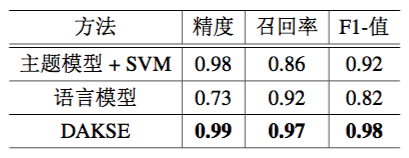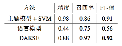 实验结果的有效性:实验通过两种方式来评估 DAKSE 是否可以很好地区分 DKS 和非 DKS。首先,通过假设种子 DKS 是正确的,实验评估 DKS 分类器是否很好地提取出了 DKS。实验选择 80% 的样本进行训练,其余的用于测试。训练过程从小说中添加相等数量的负样本。结果表示在表 7.2 中。