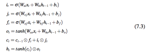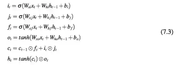 这里 σ 函数是一个 sigmoid 函数,i,f,o,c 分别是输入门,忘记门,输出门,单元激活向量,j 用于计算新的 c 值,W,b 是 LSTM 层的参数。