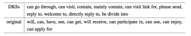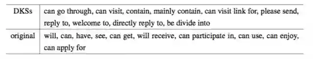为了给出提取的元组的直观描述,表格 7.7 展示了来自中国移动客户服务语料库的 DKS 的元组中频率前 10 的关系,并将结果与原始文本语料库中抽取出的关系进行比较。结果表明,根据 DKS 抽取出的元组中的关系更加清晰。这些关系直接指向用户的需求(例如 can visit link for)。相比之下,直接从原始语料库中抽取出的关系更模糊。