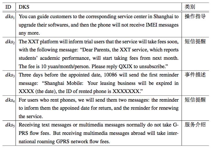 本小节评估 DAKSE 在中国移动客户服务语料上的效果。首先,实验给出提取的 DKS 的直观感受,然后评估抽取出来的 DKS 的有效性。