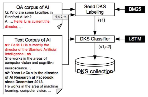 本文提出了一种数据驱动方法 DAKSE,它包含无监督的种子 DKS 标记和有监督的 DKS 分类。DAKSE 首先通过匹配纯文本句子和回答语句来标记种子 DKS。这样就弥合了它们之间的差距。然后系统进一步使用神经网络来学习 DKS 分类器。该网络包含用于对候选语句和其上下文句子建模的三个并行的 LSTM。