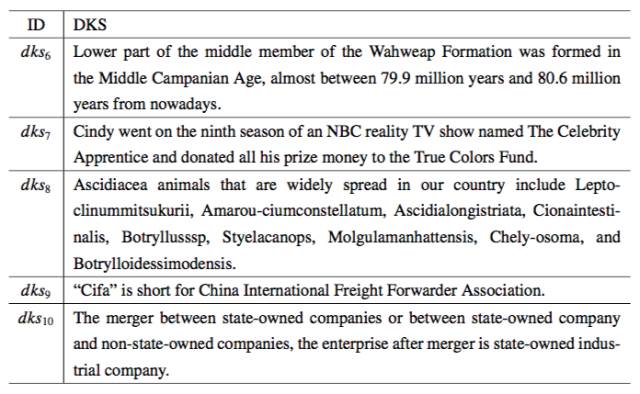 DKS 概览:DAKSE 从纯文本语料库提取总共 63543 个 DKS。为了给出 DKS 的直观感受,表格 7.1 中列出了前 5 的 DKS(由 DKS 输出层中的分数排序,该分数表现了分类的置信度)。实验发现了一些有趣的结果如下: