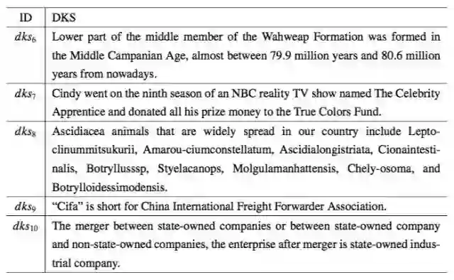 同时使用手工标注来评估 DKS 的有效性。实验随机选择 100 个 DKS。并邀请来自相关领域的志愿者标记 DKS 是否包含目标领域的有效知识。所有 DKS 被手动分成三种类型:(1) 正确 如果 DKS 是目标领域的有效知识;(2) 不相关 如果 DKS 包含知识,但与目标领域不相关;(3) 不正确 如果 DKS 没有包含知识信息。结果展示在表 7.3 中。