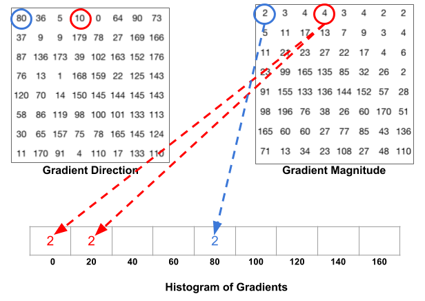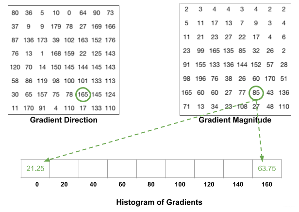 再比如:(如上图所示)某像素的梯度幅值为13.6,方向为36,36度两侧的角度bin分别为20度和40度,那么按一定加权比例分别在20度和40度对应的bin加上梯度值,加权公式为: