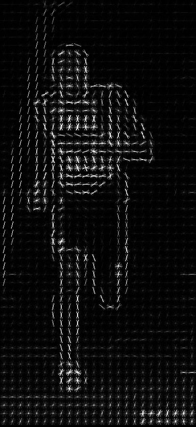 from skimage import feature, exposureimport cv2image = cv2.imread('hog.jpg')fd, hog_image = feature.hog(image, orientations=9, pixels_per_Cell=(16, 16),Cells_per_block=(2, 2), visualize=True)# Rescale histogram for better displayhog_image_rescaled = exposure.rescale_intensity(hog_image, in_range=(0, 10))cv2.imshow('img', image)cv2.imshow('hog', hog_image_rescaled)hog_image_rescaled = 255.0 * hog_image_rescaledcv2.imwrite('edge_hog.jpg', hog_image_rescaled)cv2.waitKey(0)==ord('q')