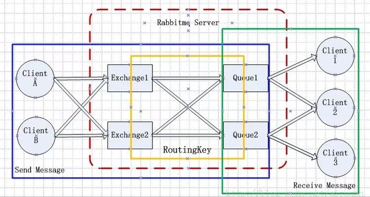消息从发送端到接收端的流转过程即 RabbitMQ 的消息工作机制,请见下图: