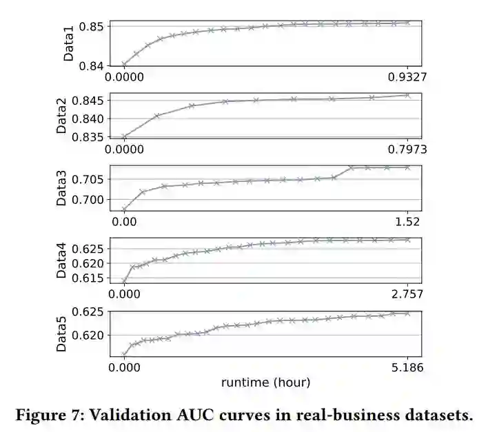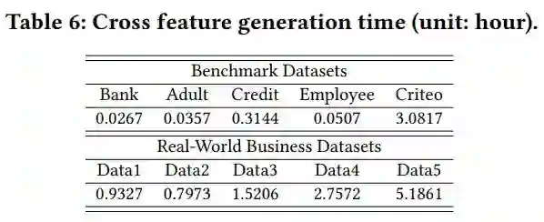 推断延迟:见表 7。从中可以得出:AC+LR 的推断速度比 AC+W&D、Deep、xDeepFM 快几个数量级。这说明 AutoCross 不仅可以提高模型表现,同时保证了很低的推断延迟。