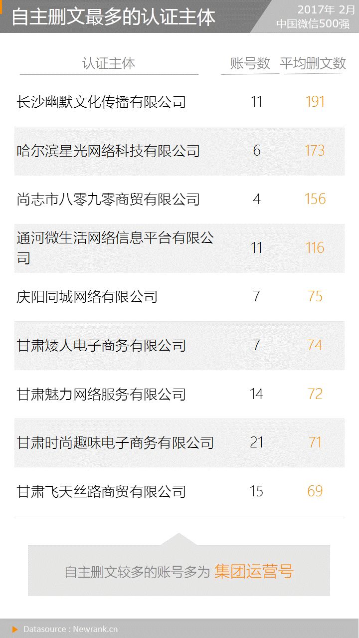 进一步观察自主删文的那些账号,发现集团号身影频现,即多数大量删文的公众号都分属于少量相同的认证主体。以认证主体为统计单位,将同一认证主体旗下的账号的平均删文数量作降序排列进行展示,具体参见下图。这些集团营销号的的特点即运作模式,新榜已在去年4月发布的《95%删文都是“主动死亡”?统计43万篇内容后我们有这些发现 | 新榜数洞》一文中进行整理。