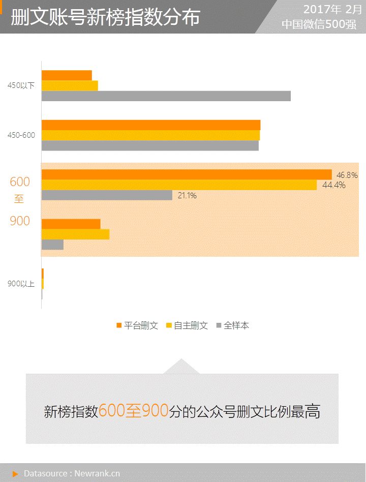 查看自主删文和平台删文的公众号新榜指数分布区间,将其与全样本的分布进行对比,发现无论是是自主删文还是平台删文,新榜指数位于600至900的公众号删文比例最高,这些公众号虽拥有一定的流量,但内容发布不及头部大号严谨,因此易被举报删文,同时为规避平台惩罚也愿意积极主动地删除不健康的内容以防封号造成流量的巨大损失。