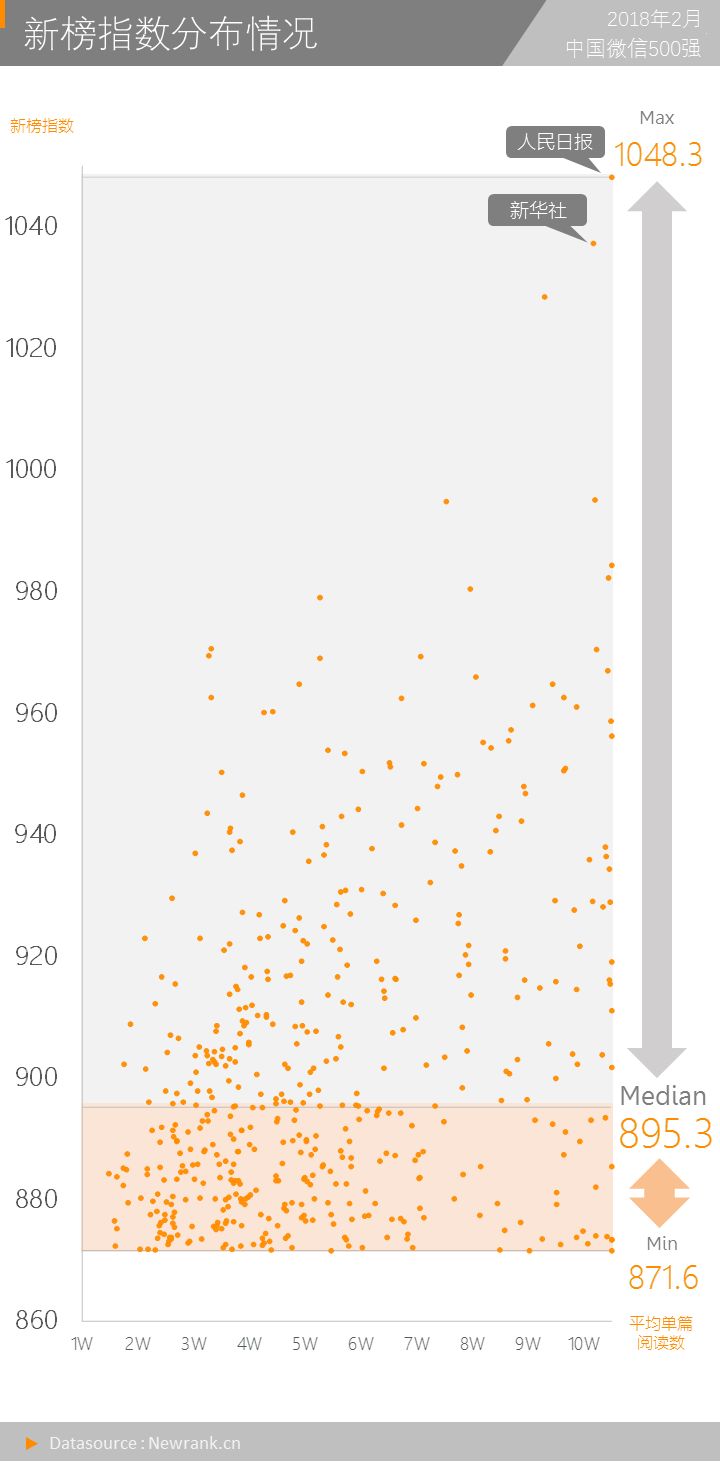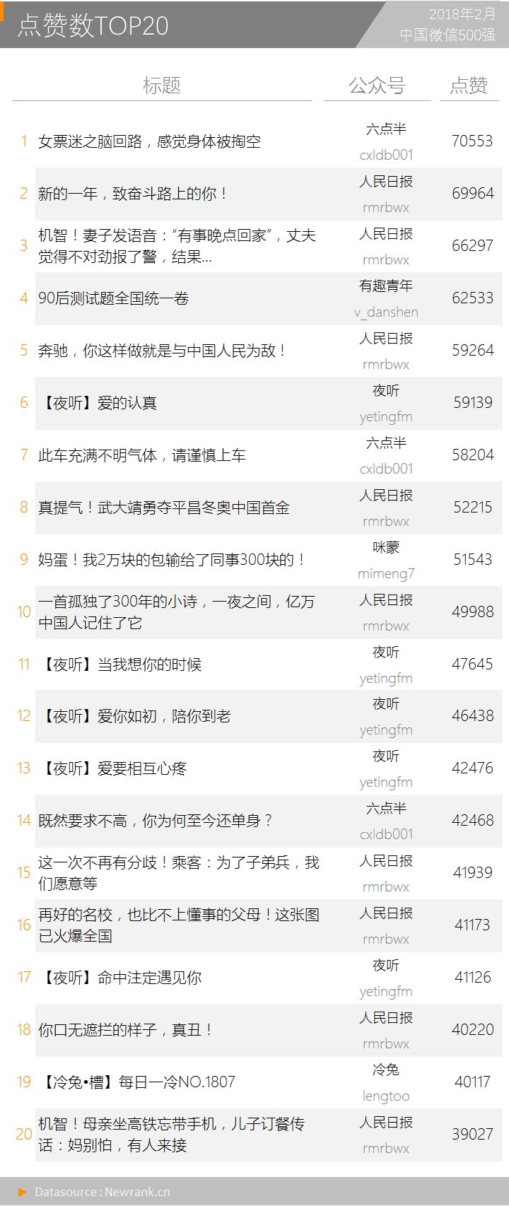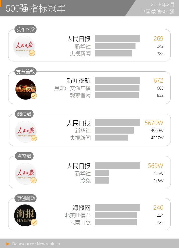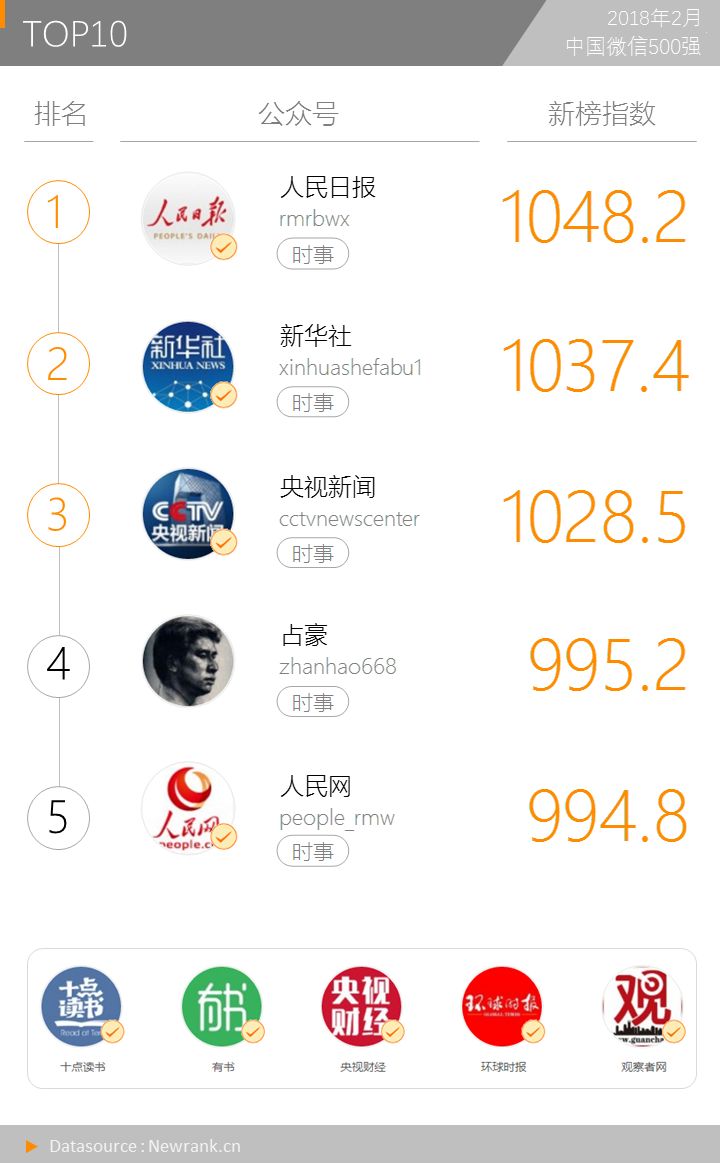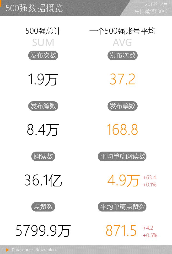 请移步"新榜排行榜"(ID:xdnphb),查看2018年2月份中国微信500强详细榜单。