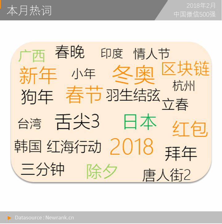 二月恰逢新春佳节,因此热词主题多数围绕春节展开,除此之外,近期最热互联网技术“区块链”、冬奥会及人气高涨的日本男子单人滑冠军羽生结弦均引起热议;陈可辛导演的催泪短片《三分钟》触动心弦,在春节前夕引爆网络;热映贺岁电影《红海行动》、《唐人街探案2》同样引起不少关注。