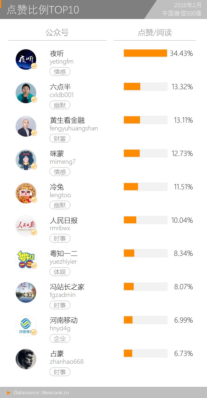 点赞比例方面,TOP10账号均现下滑迹象,“夜听”本期点赞比34.43%,环比下降约4.5个百分点;专注幽默视频的“六点半”逆势上升,平均单篇点赞数高达13204次,点赞比上升近两个百分点,收获点赞比亚军;“冯站长之家”表现稳定,上升一名,位居第七;剩余七强点赞比均有不同程度的降幅。