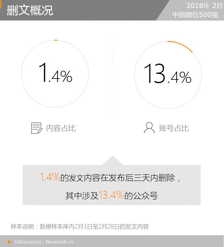 一直以来,微信对于平台内容有严格的审核及阶梯型惩罚机制。删文是最常见的解决方式,无论是公众号运营者慑于平台惩罚主动将敏感内容删除,还是因内容违禁遭平台删文。新榜通过二次采集,对全样本发文后三天内被删的内容进行统计,试图找出微信内容江湖的删文现状。需要说明的是,数据仅来源于2月3日至2月28日的全样本发文,在发布后短时间即删文,尚未被新榜获取到的内容,未纳入统计。