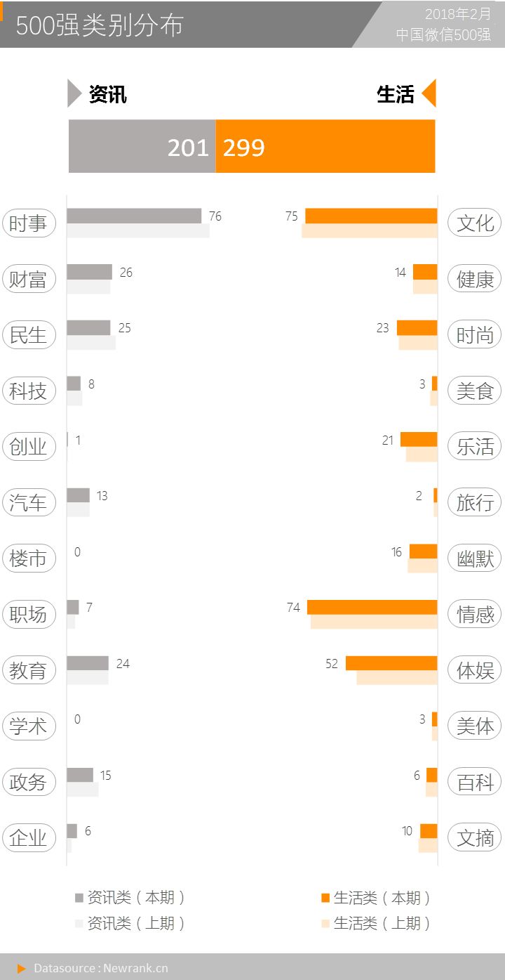500强中所占席位最多的类别位次为:时事(76)、文化(75)、情感(74)、体娱(52)与财富(26)。五强类别占据500强席位的60.6%,虽然类别三强依旧为“时事”、“文化”、“情感”,但三强之间均只有一席差距,最大类别的竞争愈发白热化。