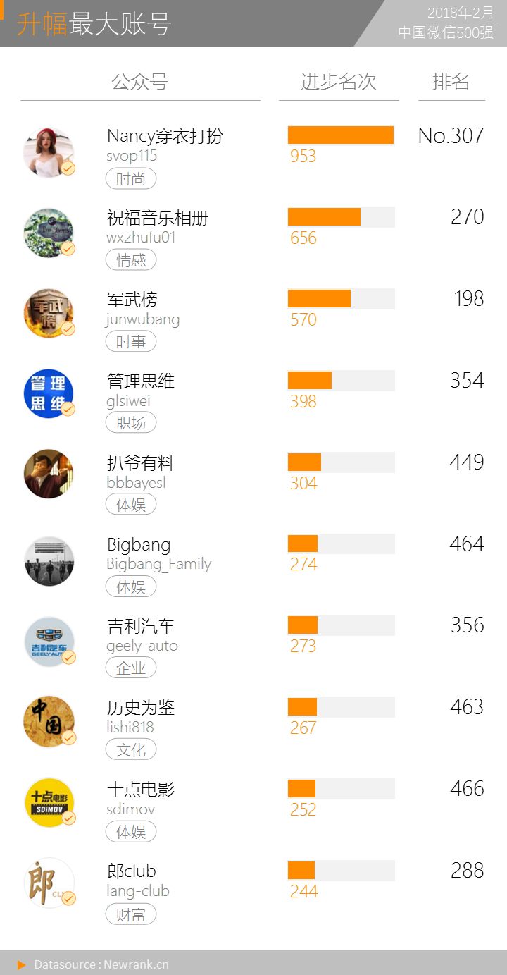 本月升幅榜中,首次进入500强的时尚类账号“Nancy穿衣打扮”独占鳌头,每天保持固定3条推文,平均阅读数环比增幅约100%,上升953名,收获升幅榜冠军;“祝福音乐相册”继去年11月之后再度跻身500强,以上升656名的表现位居升幅榜第二名;此外,“军武榜”、“扒爷有料”、“吉利汽车”、“历史为鉴”均为首次进入500强,“军武榜”势如破竹,升至第198位。