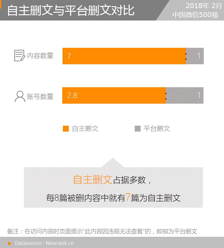 将所有删除内容划分为运营者自主删文和平台删文两种,统计可知,二者体量比例大概为7:1,即自主删文的内容占所有被删内容的87.9%,而剩下的为12.1%则为违规被微信平台删除。而从删文所涉及的公众号而言,自主删文的公众号与被平台删文的公众号约为2.8:1,也即自主删文的公众号平均删文的体量也远高于平台删文,平台政策就像达摩利斯剑一样悬在公众号运营者头顶,运营者更多会因畏惧惩罚而自行处理敏感内容。