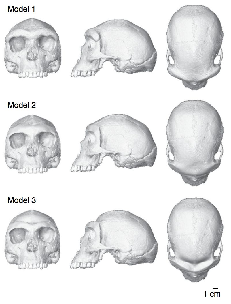 ○ 1.Kabwe 1的原始重建模型;2.削减过眉骨的 Kabwe 1的重建模型;3.削减了眉骨并加上了和眶后沟的Kabwe 1重建模型。| 图片来源:Ricardo Godinho et. al.