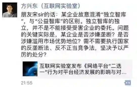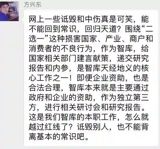 方兴东在回应中称,“作为智库,给国家相关部门建言献策、递交研究报告和内参,是智库天经地义的核心工作质疑!即便企业资助,也是合法合理,智库本来就是主要通过政府和企业的资助,作为独立第三方,进行相关研讨会和研究报告。”