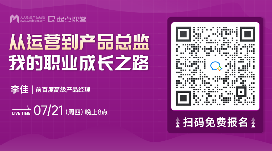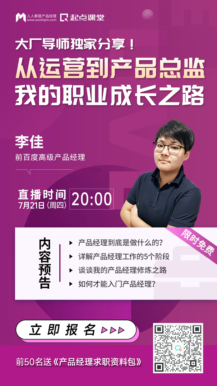 7月21日(周四)20:00-21:00,人人都是产品经理社区&起点课堂特邀前百度高级产品经理、前老饭骨产品总监@李佳,为大家分享自己从运营到产品总监的职业修炼之路。