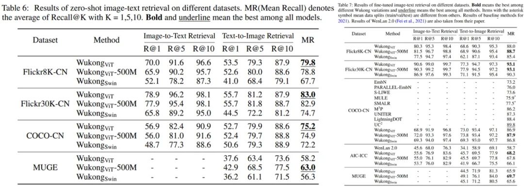 下表 6 和表 7 分别显示了零样本设定和可以微调的图文检索的结果。