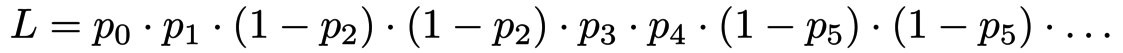 这个函数虽然看起来复杂,但如果对它取指数(L=exp(-l)),会发现这是全部样本均预测正确的概率。比如样本集的标签值分别为 (1, 1, 0, 1, 1, 0, ...),则:
