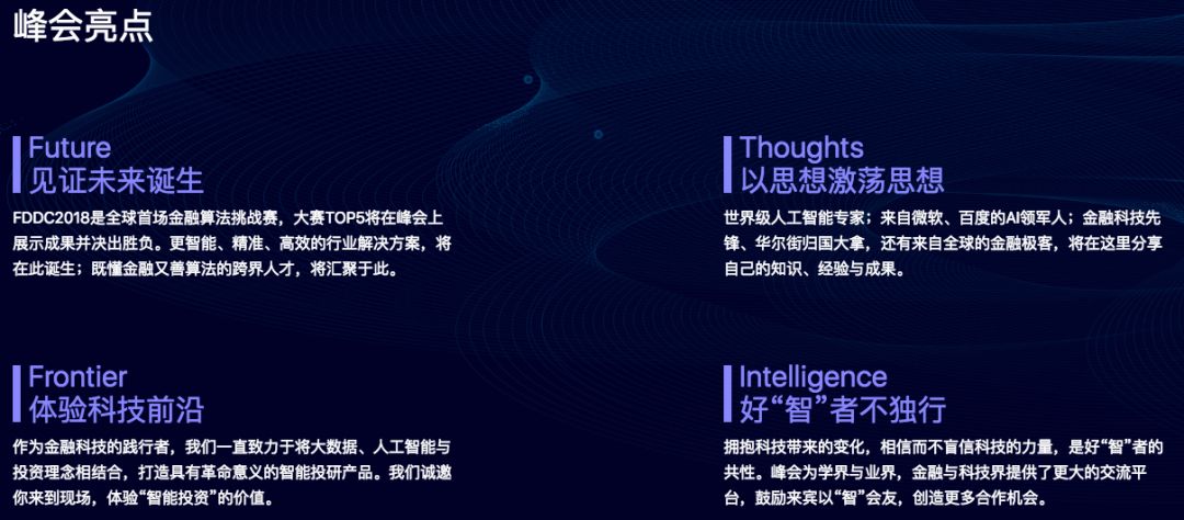 同时,历时三个月的FDDC2018全球金融数据探索与发现大赛将举行TOP5选手的最终决赛,这些选手从4800+金融极客中脱颖而出的优胜者,将在2018全球智能投资峰会向你展示他们的成果。