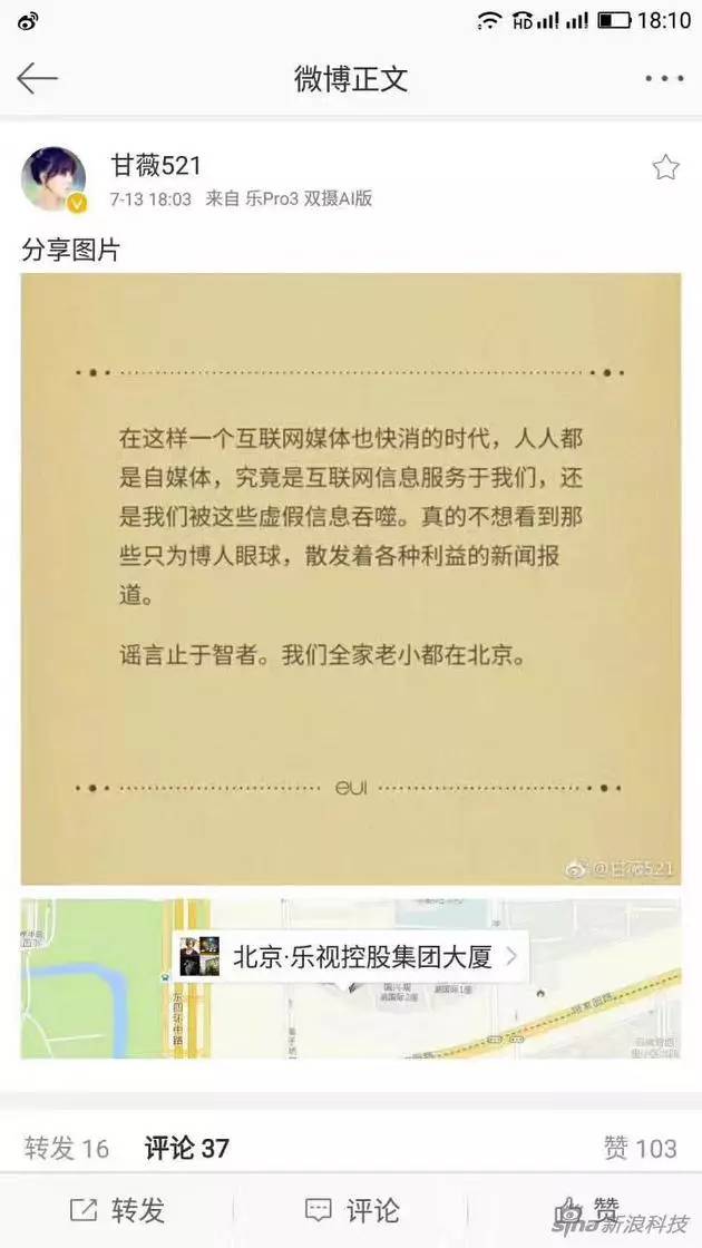 贾跃亭妻子甘薇定位乐视大厦发博:全家老小都在北京