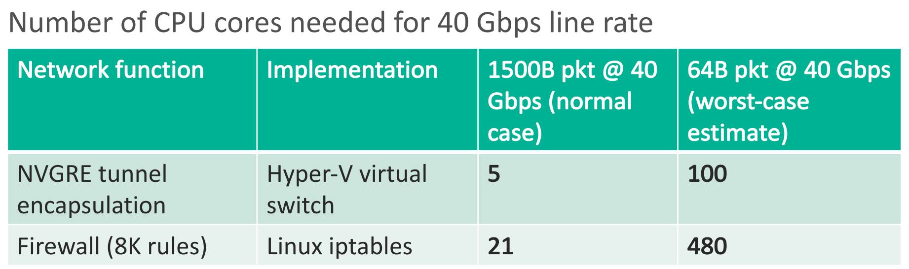 在 1 Gbps 网络和机械硬盘的时代,网络和存储虚拟化的 CPU 开销不值一提。随着网络和存储速度越来越快,网络上了 40 Gbps,一块 SSD 的吞吐量也能到 1 GB/s,CPU 渐渐变得力不从心了。例如 Hyper-V 虚拟交换机只能处理 25 Gbps 左右的流量,不能达到 40 Gbps 线速,当数据包较小时性能更差;AES-256 加密和 SHA-1 签名,每个 CPU 核只能处理 100 MB/s,只是一块 SSD 吞吐量的十分之一。