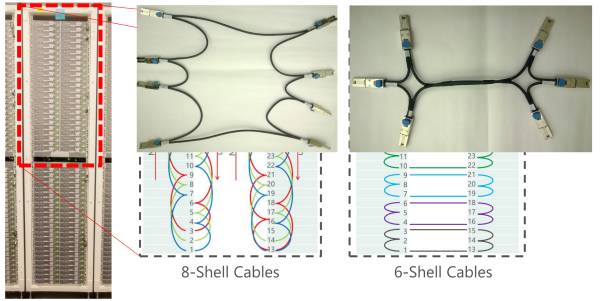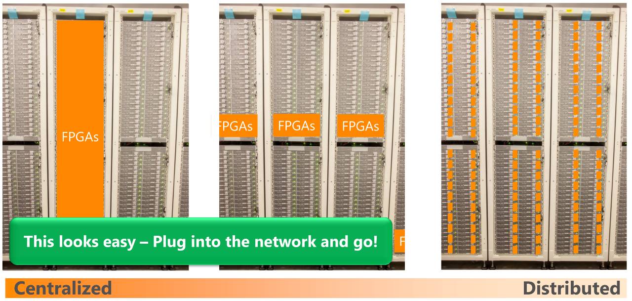 像超级计算机一样的部署方式,意味着有专门的一个机柜全是上图这种装了 24 块 FPGA 的服务器(下图左)。这种方式有几个问题: