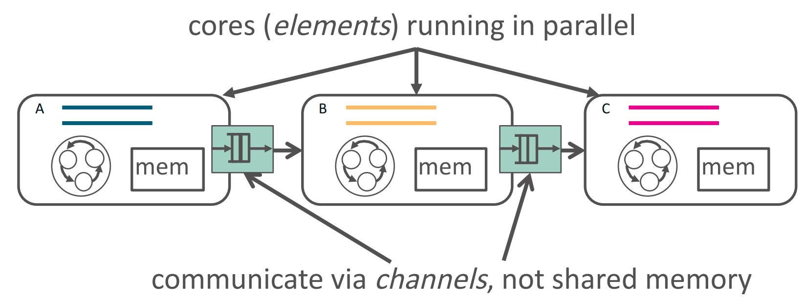 因此我们提出了 ClickNP 网络编程框架 [5],使用管道(channel)而非共享内存来在执行单元(element/kernel)间、执行单元和主机软件间进行通信。需要共享内存的应用,也可以在管道的基础上实现,毕竟 CSP(Communicating Sequential Process)和共享内存理论上是等价的嘛。ClickNP 目前还是在 OpenCL 基础上的一个框架,受到 C 语言描述硬件的局限性(当然 HLS 比 Verilog 的开发效率确实高多了)。理想的硬件描述语言,大概不会是 C 语言吧。