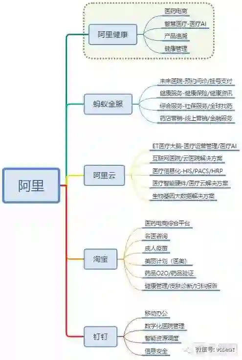 谈阿里健康的发展必然会带出整个阿里系在医疗健康领域的布局。动脉网梳理发现,阿里系几乎所有的大型公司都有医疗相关的业务,比如蚂蚁金服的未来医院、健康服务、金融服务、保险服务,阿里云的医疗信息化、云解决方案、生物基因大数据解决方案,淘宝的成人疫苗、美丽计划,钉钉的数字化医院等。