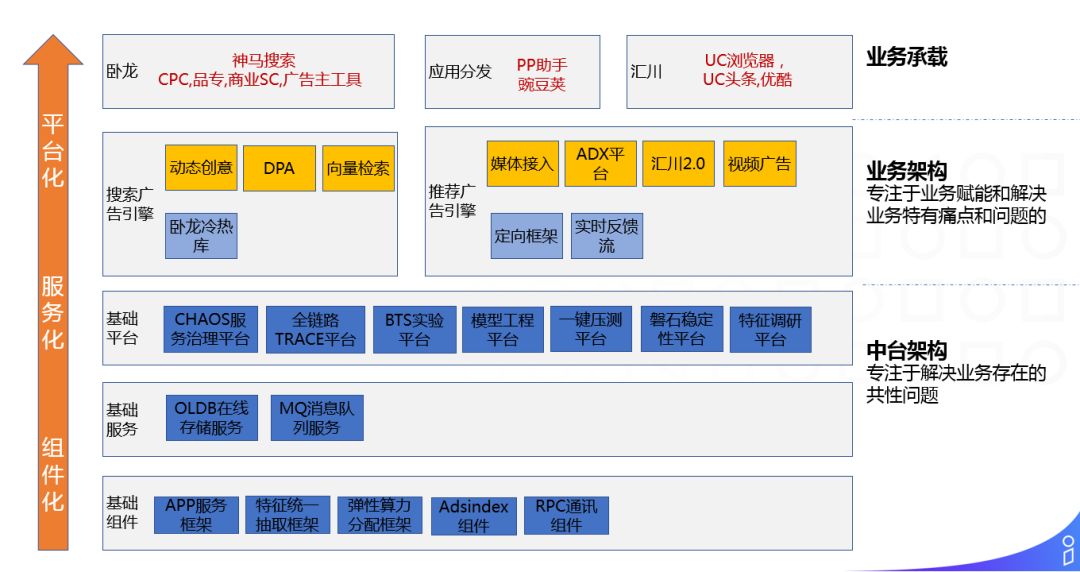 业务架构:专注于业务赋能和解决业务特有痛点和问题。比如在搜索广告中会做一些动态创意,商品检索库等事情。对于展示类广告,比如媒体接入平台以及广告交易平台 ADX 等,都是展示类广告所需要做的事情;另一方面通过针对性的架构优化解决业务的特有问题 ( 如冷热库,定向框架,实时反馈流等 ),综合来推动业务的发展。