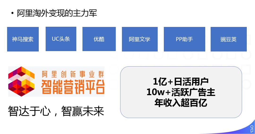 智能营销平台依托于阿里创新事业群和阿里大文娱的媒体矩阵 ( 包括神马搜索、UC 头条、优酷、阿里文学、PP 助手、豌豆荚等 ),可以覆盖1亿+的日活用户,在广告主侧,有 10W+ 的活跃广告主,年收入超过百亿,成为阿里淘外变现的主力军。