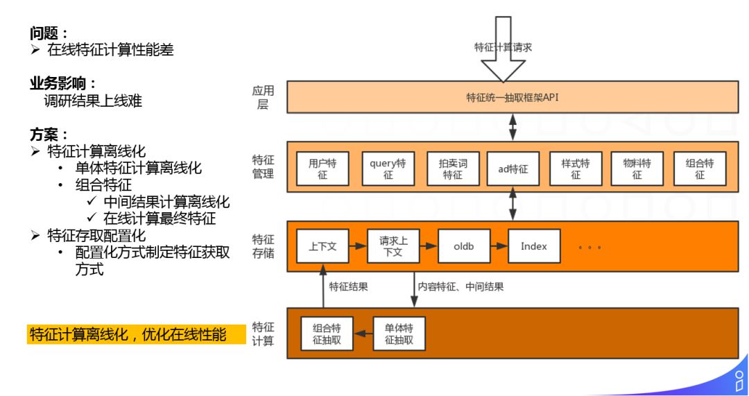 对于这块的我们主要通过特征计算离线化的方式进行优化,大家可以看一下我们系统中用到的主要特征,例如用户特征,query 特征,拍卖词特征,ad... 这些特征都是单体特征,对于这类特征,我们通过离线计算,在线获取的方式进行了优化,对于组合特征,我们离线计算好中间结果,只对最后的 combine 环节做在线计算,最大优化性能。此外,我们还通过插件配置化的定义特征获取的方式,提升了这块的工作效率。