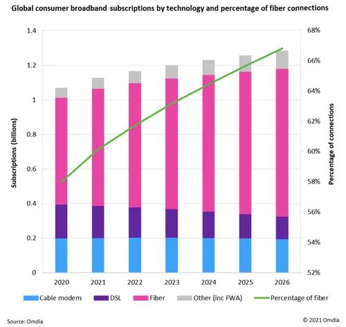 根据市场研究公司Omdia的一份最新报告,预计到2022年全球千兆宽带用户签约数量将跃升至5000万,比2020年底的2400万增加一倍多。Omdia表示,光纤网络部署的加速,有助于推动千兆连接的增加。分析师写到,“截至2020年底,全球的光纤网络用户数量不到6.2亿,但我们预计2022年这一数字将增至7.19亿。其中大多数光纤用户增长将出现在中国市场。”